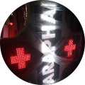 Croix de pharmacie multicouleurs avec projection vidéo, croissants lumineux et enseignes personnalisées. Communication RJ45 ou WiFi intégrée pour un pilotage à distance.