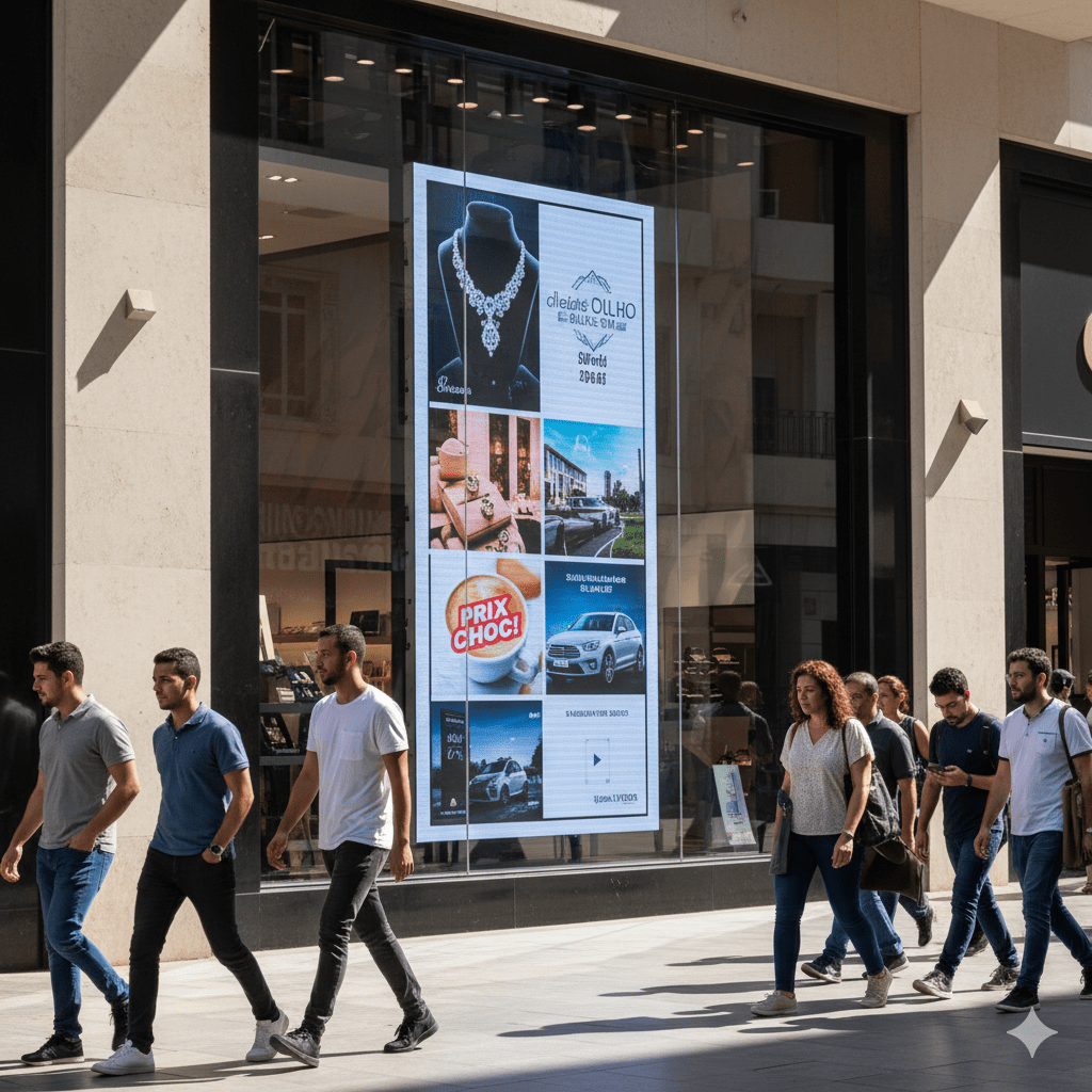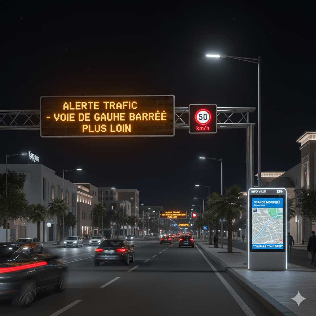 Écrans haute luminosité résistant aux conditions climatiques marocaines. Gestion de contenu intuitive pour campagnes publicitaires dynamiques et rotation d’annonceurs.